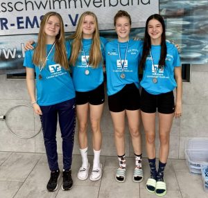 Die offene Mannschaft (2015 und älter; weiblich) mit Malinsa, Chamithi, Johanna und Andrea schwamm wie die Jugend C (2012/2013; weiblich) mit Finja, Melina, Lotta, Freyja und Ida drei Staffeln. Beide Mannschaften konnten tolle Erfahrungen sammeln, denn Wettkämpfe mit ausschließlich Staffeln gibt es nur bei diesem Wettkampf.